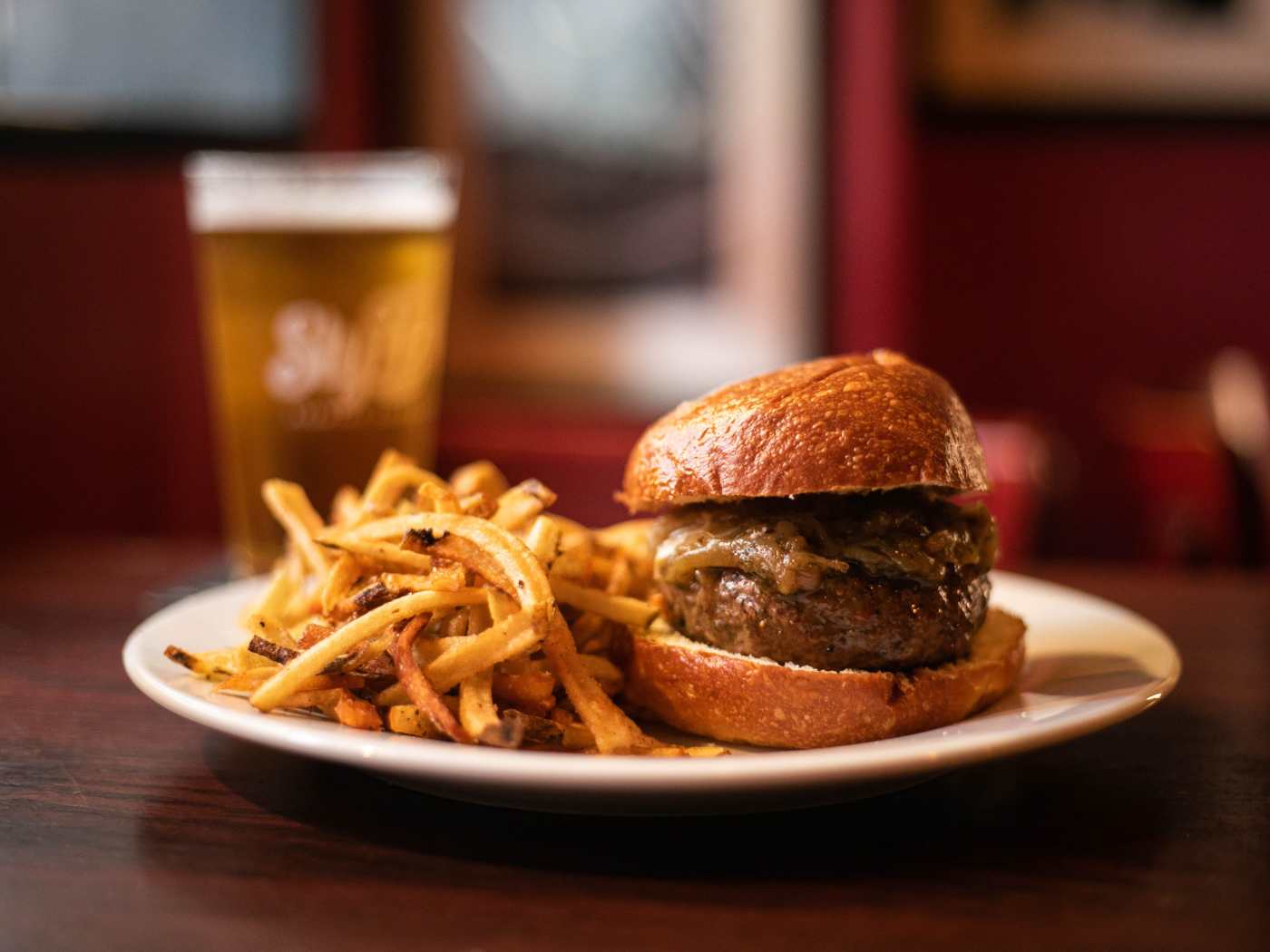 Craft beer, signature blue-cheese burgers, dog photos, late night