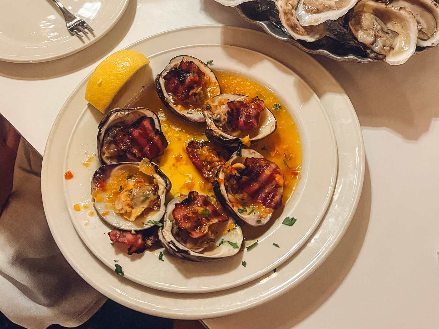 "Almost as a rule, we recommend you stick to enjoying the raw seafood (and the beautiful vaulted ceilings) at Grand Central Oyster Bar, but there are two important exceptions. First: You should get a martini, which is strong to begin with, and comes with a sidecar. You should also get the clams casino. Grand Central Oyster Bar's breadcrumb-less rendition is laden with thick, juicy pieces of bacon. It's solid, and makes for a good snack to help soak up that martini." - willa moore, molly fitzpatrick, neha talreja