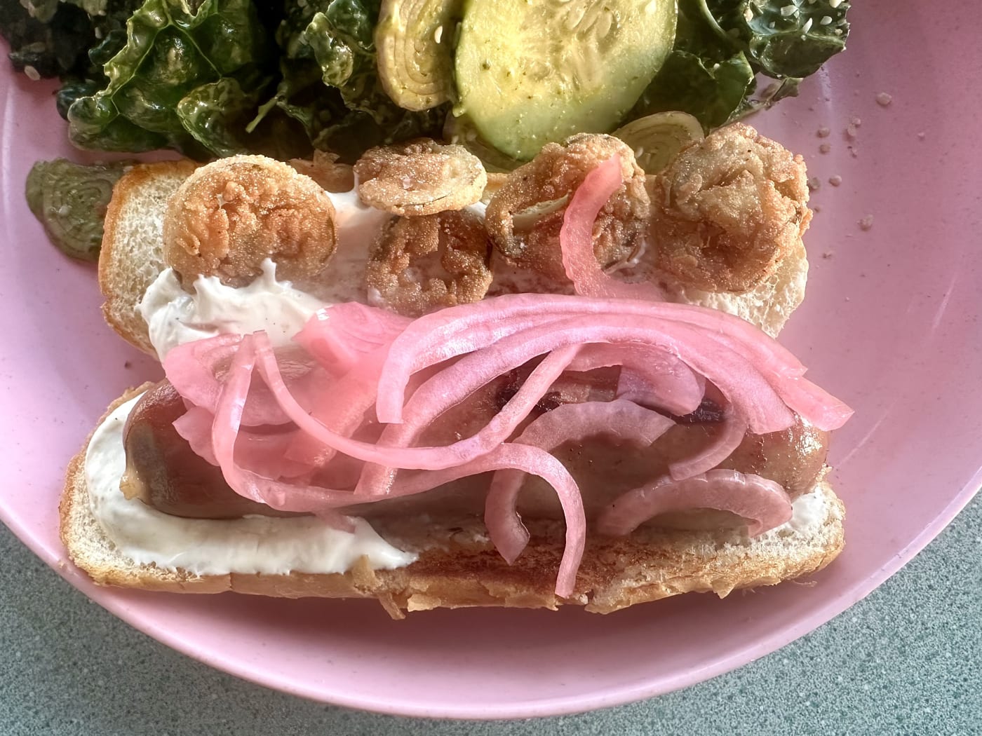 "The Seattle dog at this 90s-themed brewery is particularly girthy and rich—if sausage is the priority, consider that wish granted. (Thanks, hot dog genie.) And the thick link’s supported well by a few elevated touches like a double-tangy combination of cream cheese and whipped chevre, pink pickled onion, and tender fried jalapeño slices dredged in cornmeal that add a decent crunch. The downsides? This sloppy beast is a structural catastrophe, and at the end of the day, there’s really no need to bring goat cheese into the equation." - gabe guarente, aimee rizzo
