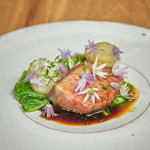 "'Hjem' means 'home' in both Scandinavian and Northumbrian dialects, uniting the birthplaces of owners Alex and Ally. The restaurant is located inside The Hadrian Hotel, with all guests arriving for an aperitif in a part of the building that feels more like the village local, before moving to the contrastingly pared-back dining room. In a nod to Chef Alex's Swedish heritage, the meal finishes with his version of 'fika' – as the table becomes covered in an assortment of sweet treats and snacks, it makes for a generous and fittingly memorable end to a superlative experience." - Michelin Inspector