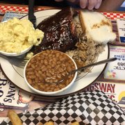 My stepson got the stew, corn, greens, meatloaf, and a cornbread muffin. I don't know what my husband got, the fried chicken was calling my name and I put my camera up.
