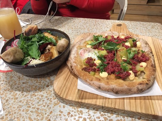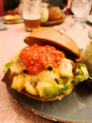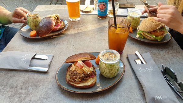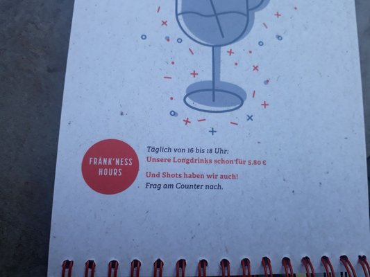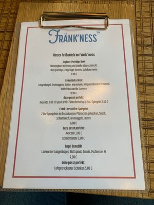 Frank'ness was a welcomed change from our food experiences in Germany! Their menu is really different, even from many you'd see in the US. Very chic and trendy with exciting combinations that make you think you'd like to sample half of the menu in one sitting. Also, we were greeted with such a friendly member of staff- who also waited on us, that it made the whole experience that much more enjoyable. We brought a 1 year old with us and they don't have highchairs...and most of the seating is high-top stools, so that is a challenge with a little one. Our waiter was nothing but helpful and patient as we tried to situate our little one and checked on us frequently to make sure there wasn't anything extra he needed. They also had menu's in English, which we haven't found everywhere, so that was good.