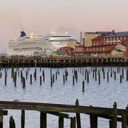 They're in one of those dockside buildings that kinda looks like a giant house, thanks to the way it was built (especially the siding and windows). You're right by the water, with that giant rivermouth bridge looming over you in the background.