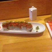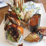 The salmon nigiri was soft and delicious, though the salmon was splitting apart all over at the natural lines. Super dragon is shrimp tempura and cucumber inside seaweed and rice maki with avocado and eel on top; this roll came with a cold sauce on it, which I thought would have been nicer if it was warm.