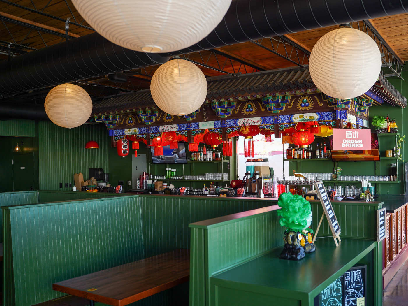 "You are missing out if the only barbecue you’re eating in Charleston is smoked brisket, whole hog, or pulled pork though. This spot behind Jackrabbit Filly does Chinese barbecue with a Carolina influence in North Charleston, and it’s a fun group lunch, dinner, or happy hour move. Walk inside past the two massive 500-pound lion statues the team flew in from China that flank the entrance, place an order at the counter, and find a table under the lanterns at the bar or a booth in the main dining room. Get some smoked meats by the pound, like five-spice duck or chopped smoked pork, along with a rice plate that comes with crispy pork belly or cha shao spare ribs, bok choy, and a ginger scallion relish." - jai jones, emily yates