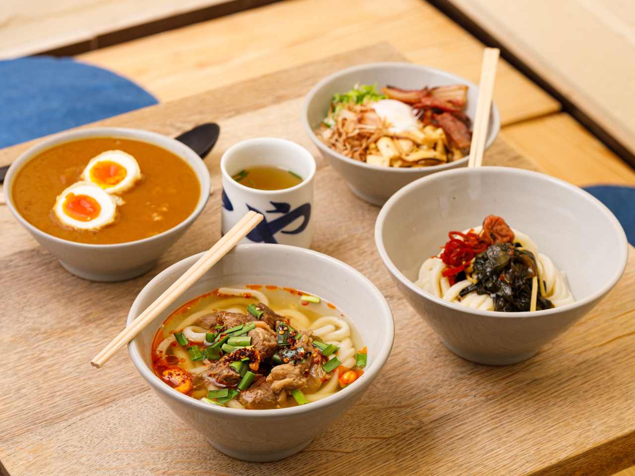 Handmade udon noodles, donburi, and kara-age fried chicken.