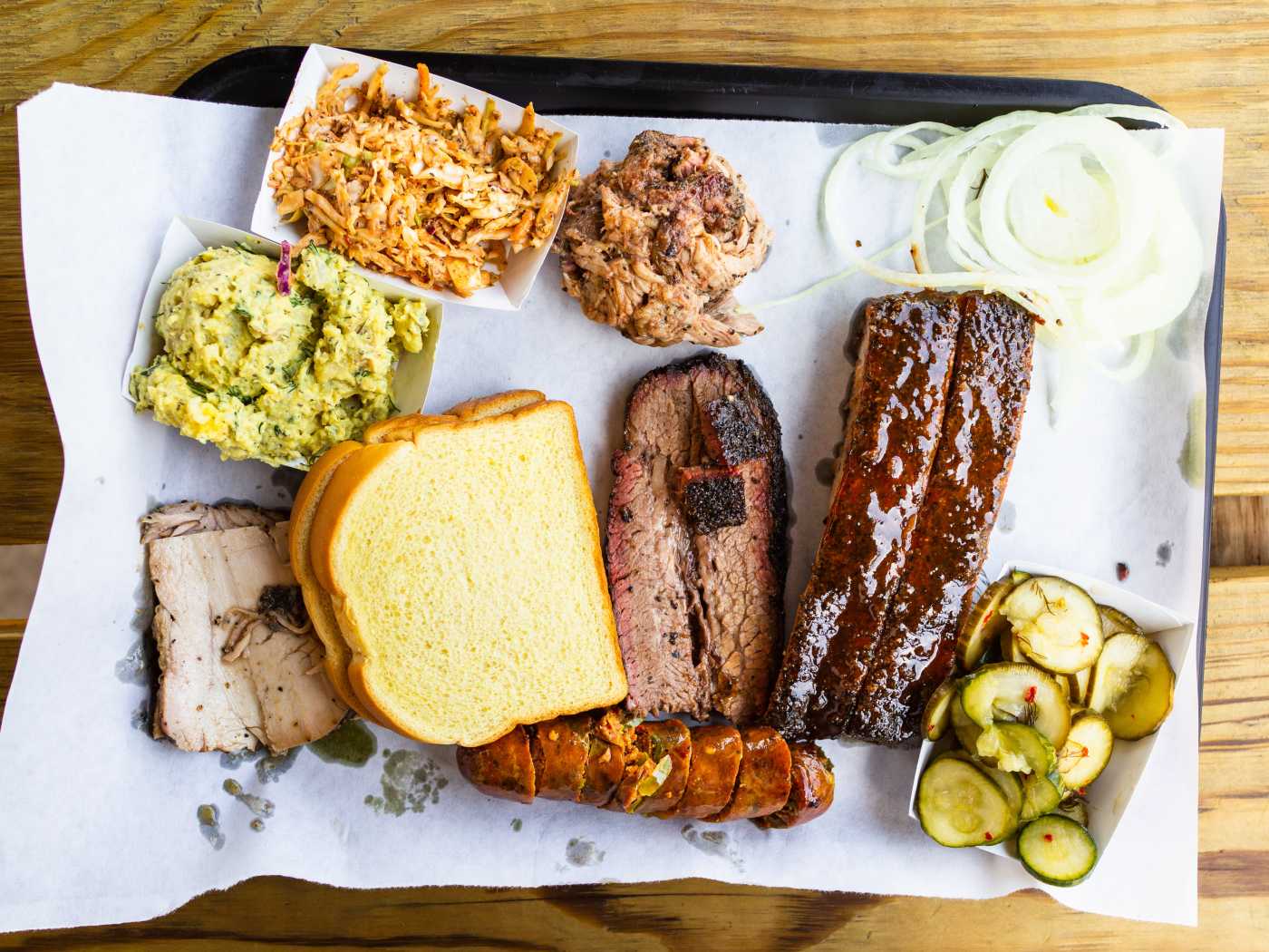 Wondering about lower Alabama, I found LA BBQ with a 5 star rating so I had to try it. First of all, it is a very clean, kind of homy place. I went with the 3 meat with ribs, pork, and brisket and beans, slaw, and potato salad. For the amount of food I received, it was a good price. The ribs had an excellent seasoning to them. They were big and meaty spare ribs but surprise, very tender meat. Perfect for ribs! The pork itself was a little bit on the dry side but it had some kind of seasoning I have never had before. Brisket was pretty good, but nowhere near as good as the ribs and pork. I had a hard time with the sauces because there were soooo many of them. Allow me to save you the trouble because some of them were not very good. The white sauce tasted too mayonaisey compared to other white sauces I've had across the state. The mustard and carolina sauces were truly lacking in something. So the 3 sauces that made the cut were the Texas, Sweet, and 4 Alarm. The texas had a mild flavor to it. The Sweet was the best of them all as maple syrup was a key ingredient. The 4 Alarm was more like the sweet than Texas and it was one of the kinds that doesn't taste hot at first, but after the 2nd bite, it had a pretty substantial heat to it. The beans were sweet and thick. The slaw was a spicy mayo base and potato salad was sour cream, baked potato base. The sweet tea was pretty good. LA BBQ should be a must try in the state of Alabama. I had to give it a 4 because 3 of their sauces were disappointing. But other than that, really great stuff especially the ribs and pork.
