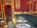 "On a trip to Paris, owner Lou Beraud had a sad epiphany about missing the affordable, charming restaurants foundational to the City of Lights: “We went to [Parisian restaurant] Bouillon Chartier and realized that there was no place like that in Oakland,” says Beraud. That realization led her to open a little wine bar where people could come and enjoy wines from around the world, small plates of food and companionship; it opens Saturday, May 10. The space is fanciful and belle époque–inspired, with a deep golden accent color “reminiscent of a popular French champagne label” showing up on curving Art Nouveau details framing the bar, the mirrors, the doors, and the hand painted artwork on the front window; vivid color, feathery ceiling lights that “evoke can-can dancers,” touches of deep magenta, and an opulent emerald green on tile and velvety channeled banquettes complete the look. Her husband Peter Andreoni, a contractor who specializes in custom woodwork, created many of the curved flourishes that frame mirrors and doorways. The soundtrack runs from Josephine Baker’s “J’ai Deux Amours” and “La Vie en Rose” to modern artists like L.E.J., Bon Entendeur, and Stromae. Beraud, who worked for Champagne Cristal and sold French wines in Silicon Valley with the distributor Planet Wine, built a wine list rooted in France (70 to 80 percent sourced from regions including Loire, Burgundy, Languedoc-Roussillon, and Bordeaux) while also representing California and Italy; there are quirky bottles like the Moroccan-made Syrah called Sirocco from Alain Graillot and natural-wine selections such as 23 Monje, “an orange skin-fermented blend of organic grapes including French Colombard and Gewürztraminer from Santa Cruz. It smells like lychee and pink grapefruit.” “It’s an orange wine, but not a weird orange wine,” Beraud says. Besides a rotating list of wines by the glass, about 100 selections can be purchased by the bottle to enjoy on site or take home, with plans to expand to 200 or 300 and to offer educational events: “I want it to be educational too,” she says. “All the information looks scary on the bottle but it’s not once you get the hang of it. I was thinking of doing little tasting classes, events, and different cheese and wine pairings with some info as well on the wines.” The chalkboard menu runs from cheese and charcuterie boards to marinated olives and spiced nuts; heartier fare includes bacon and Comte cheese puffs served with mixed greens, duck rillettes, croque-monsieur warmed on a panini press, and melty raclette cheese on a baguette with salami and tangy slices of apple. Charcuterie will be a focus, with precise slices from a fire engine–red Berkel meat slicer with a vintage-inspired flywheel. Andreoni noted that while many of their friends work in Michelin-starred restaurants, they can’t afford to actually go to that restaurant and enjoy the food they’re serving; the couple hopes the wine bar will be an egalitarian antidote to that phenomenon, modeled on Parisian bouillons (affordable restaurants dating back to the 19th century, like Chartier, which dates to 1896) that served classic French fare with hearty portions and fast service and often encouraged communal seating and conversation. Beraud hopes the spot will become a neighborhood hangout for people of different ages and backgrounds: “I would go to the same place with my friends that everybody enjoys,” she says. “It’s a mix in Paris. It’s not categorized.” Opening hours will be 2 to 9:30 p.m. Wednesdays and Thursdays and 2 to 10 p.m. Fridays and Saturdays." - Maria C. Hunt
