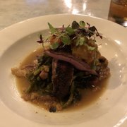 The restaurant's romantic ambience and excellent service got the evening off to a promising start and raised our expectations for a wonderful evening. The dining area has a rustic modern vibe with dim, warm lighting. We appreciated the acoustic paneling on the ceiling, which meant that even as the restaurant filled and the noise level increased my wife and I could still hear one another at a conversational volume.