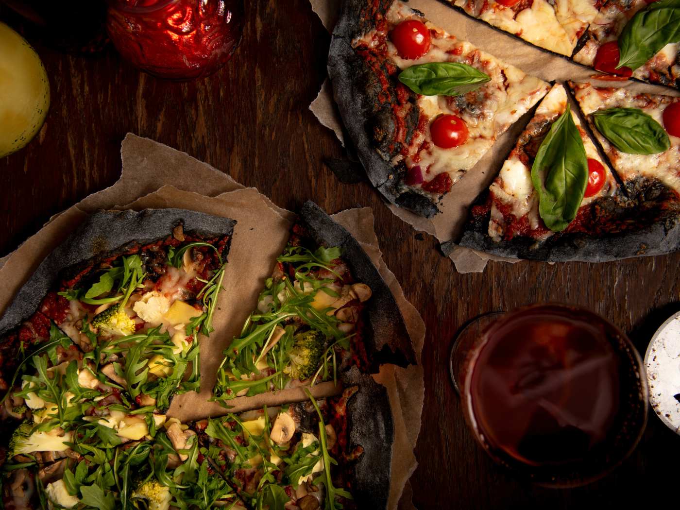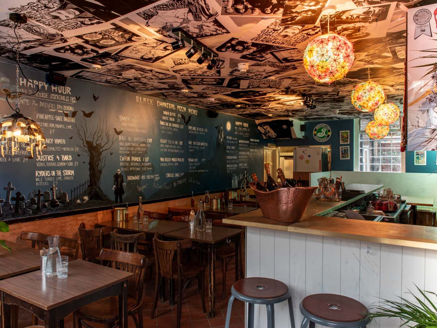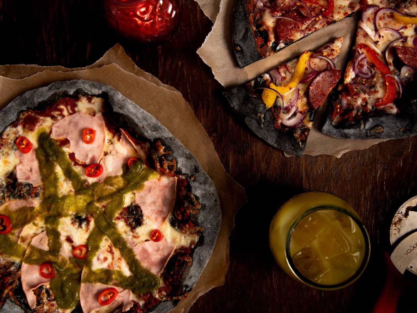 Vampire-themed pizzeria serving black dough, killer cocktails, & 80s music