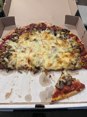 Me and my husband got a "small" pizza with pepperoni and sausage and a small order of spaghetti with a meatball to share. The pizza was thinner crust (which usually I'm partial to) and it was cut in squares, which really just hits different. This pizza was SO good and it was definitely not small. She also brought both of us huge dishes of ranch, like quality ranch. The pasta was also AMAZING, so much sauce and flavor and that meatball was so good. I think they have a really good sauce recipe that makes everything SO good.