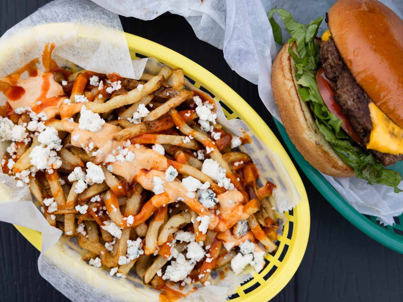 Creative burgers, loaded fries & hip vibe with outdoor seating
