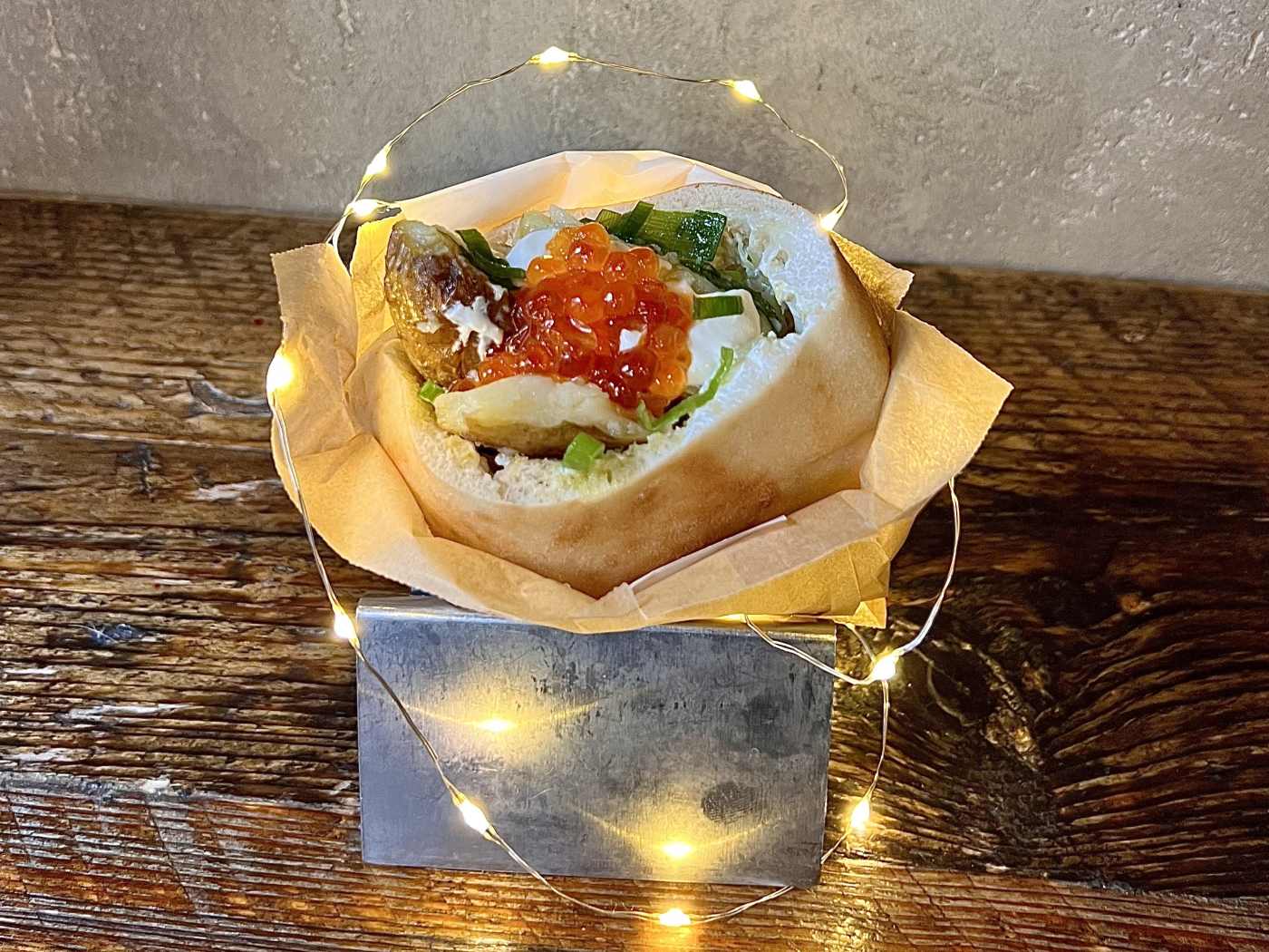 "Never ones to go down the much-trodden path, Miznon has ignored the dry advances of turkey in favour of something altogether more canapé-inspired, especially as it comes with a glass of Möet. The festive dish from the Israeli pita specialist is like a big, pocked-shaped blini. It’s stuffed with sour cream, fried potatoes, spring onion, and a dollop of salmon roe on top." - Jake Oliver