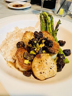 Now finally, the scallops. I was hesitant about my first bite because of all the reviews lately that it's dry and grainy!! So there I was, cutting it in half, which I was pleasantly surprised that I got more than two scallops on my plate. I actually had five with a delicious rosemary risotto and chard asparagus. Anyways I was taking that bite into the scallop, waiting for this hard, grainy taste, and it was so perfect soft melted right your mouth amazing goodness one of the best scallops I've ever had I was so happy ordered this dish. // if you're ever in doubt, definitely order the scallops. They are great mouthwatering goodness.