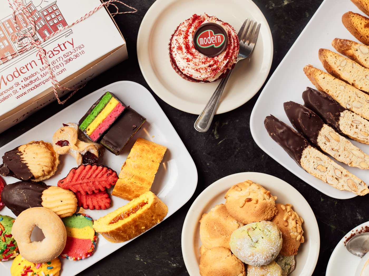 "Bostonians are fiercely loyal to their favorite “authentic Italian” bakeries, but we are, bravely, willing to say that Modern Pastry sells the best cannoli on Hanover Street. Modern has fewer shell and filling options than other bakeries, but what they lack in variety they make up for in quality: the cannolo shell here is thicker and drier than others, and the creamy ricotta filling is only lightly sweetened, helping Modern’s pastries avoid the teeth-achingly rich flavor of lesser cannoli at other spots in town. We go for the chocolate dipped shell with traditional ricotta filling and a pistachio topping. The line outside this cash-only shop is intimidating but moves quickly. Linda Camposphoto credit: Linda Campos" - Lala Thaddeus