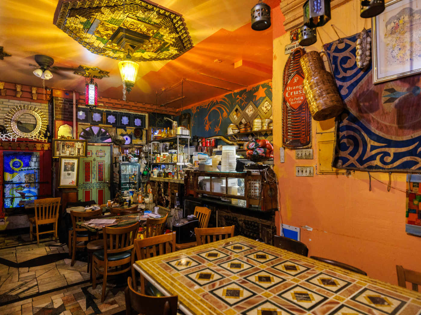 Most nights, Mustafa is also the host, gauging whether he has enough space to prep food for another table each time someone walks through the door and into the sheet-draped dining room. Part magpie's nest, and part decades-long art installation, this room is an essential part of the experience. Found objects plaster the mosaicked surfaces, with everything from a New York license plate to a marble fireplace melding into one sculptural whole: a mass of statuettes and fencing sets, Eyes of Horus, and old tin advertisements. It's all cobbled together from here and there, and slowly assembled by hand—just like the food.