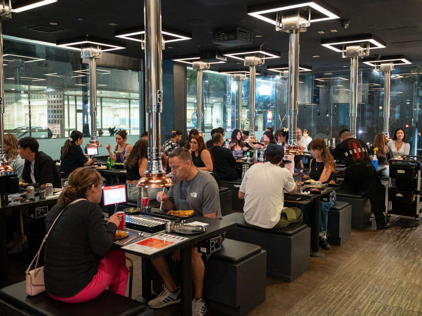 "I see Moohan as an upscale all-you-can-eat Korean barbecue in the former Gwang Yang BBQ space that focuses on strictly premium cuts — pork belly, beef brisket, New York steak, and rib-eye — and even offers an A5 wagyu omakase option. Positioning itself to redefine the all-you-can-eat scene, the On6thAvenue-backed spot provides multiple tiers of set meals starting at $34.99 and rising to $89.99 for the wagyu omakase with unlimited meats. In addition to large quantities of high-quality meat, Moohan serves an unlimited buffet of Korean sides and banchan, including japchae, tteokbokki, kimchi gimbap, house-made kimchi, and cucumber salad, plus stone pot bibimbap, spicy tofu soup, and Buldak ramen with cheese torched tableside. Drink options include soju cocktails and specialty bottles like Yangchon Chungju, as well as beer and wine. Inspired by Seoul’s late-night energy, owner Chris Lee and his team designed a futuristic, upscale-steakhouse interior with clean lines and dark colors to bring this concept to Los Angeles." - Rebecca Roland