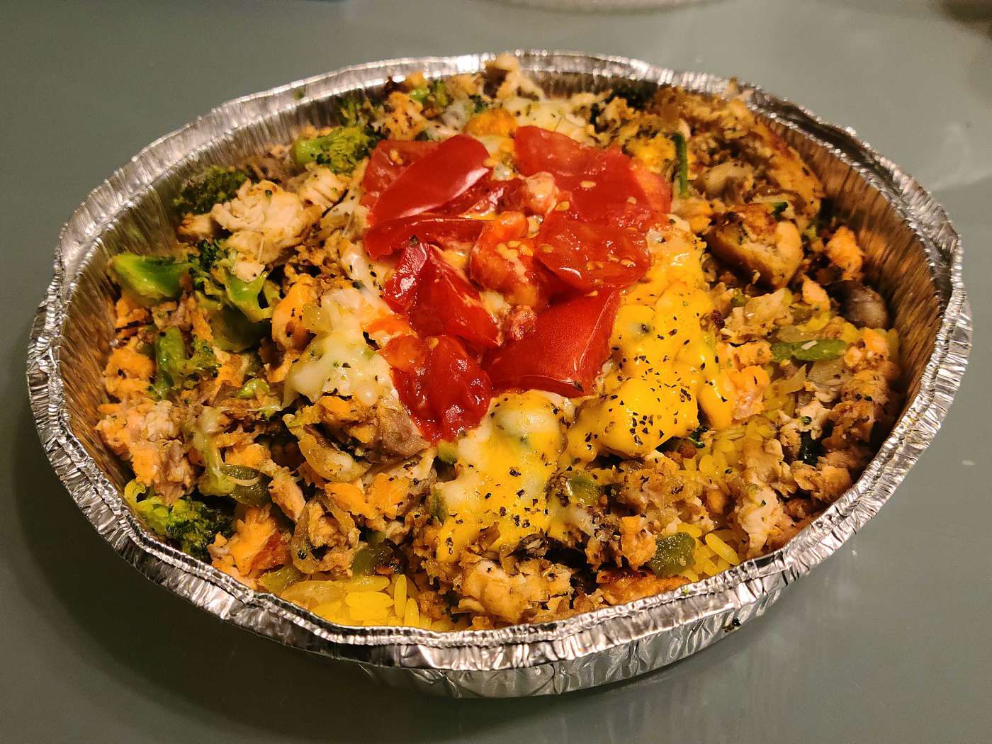 The famous "everything" dishes are listed on the menu as "healthy choice", and yeah, it has a couple vegetables- but it's still everything BUT healthy. Broccoli, onions, mushroom, bell pepper, tomato (I opted out) smothered in 3 cheese with your choice of meat (chicken, shrimp, salmon, steak) all over a hefty helping of yellow rice. They also have a nice selection of sauces to top your food with. Spicy creole (BOMB!), teriyaki, chipotle just to name a few, and they give you two for the free.
