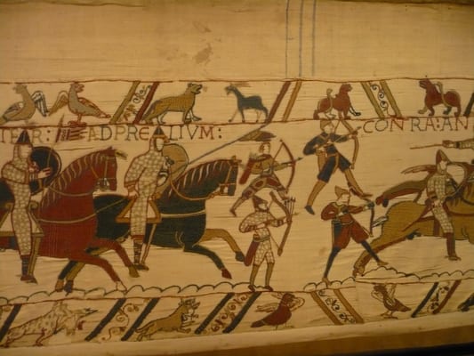 Medieval tapestry depicting Norman conquest with informative audio guide
