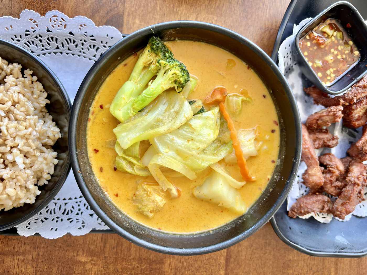 Tom Kha with shrimp 5/5, we ordered it medium spicy, and that's about my limit of spicy, but that broth!!! So tasty with just a touch of sweetness to play off the sour spiciness.