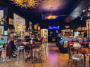 There’s easy free parking around the building. They have some seating throughout including a colorful kid’s seating area in the back, high top tables, bar seats along the cafe area, low top tables by the front, a couch with nearby arm chairs, and outdoor seating in the back.