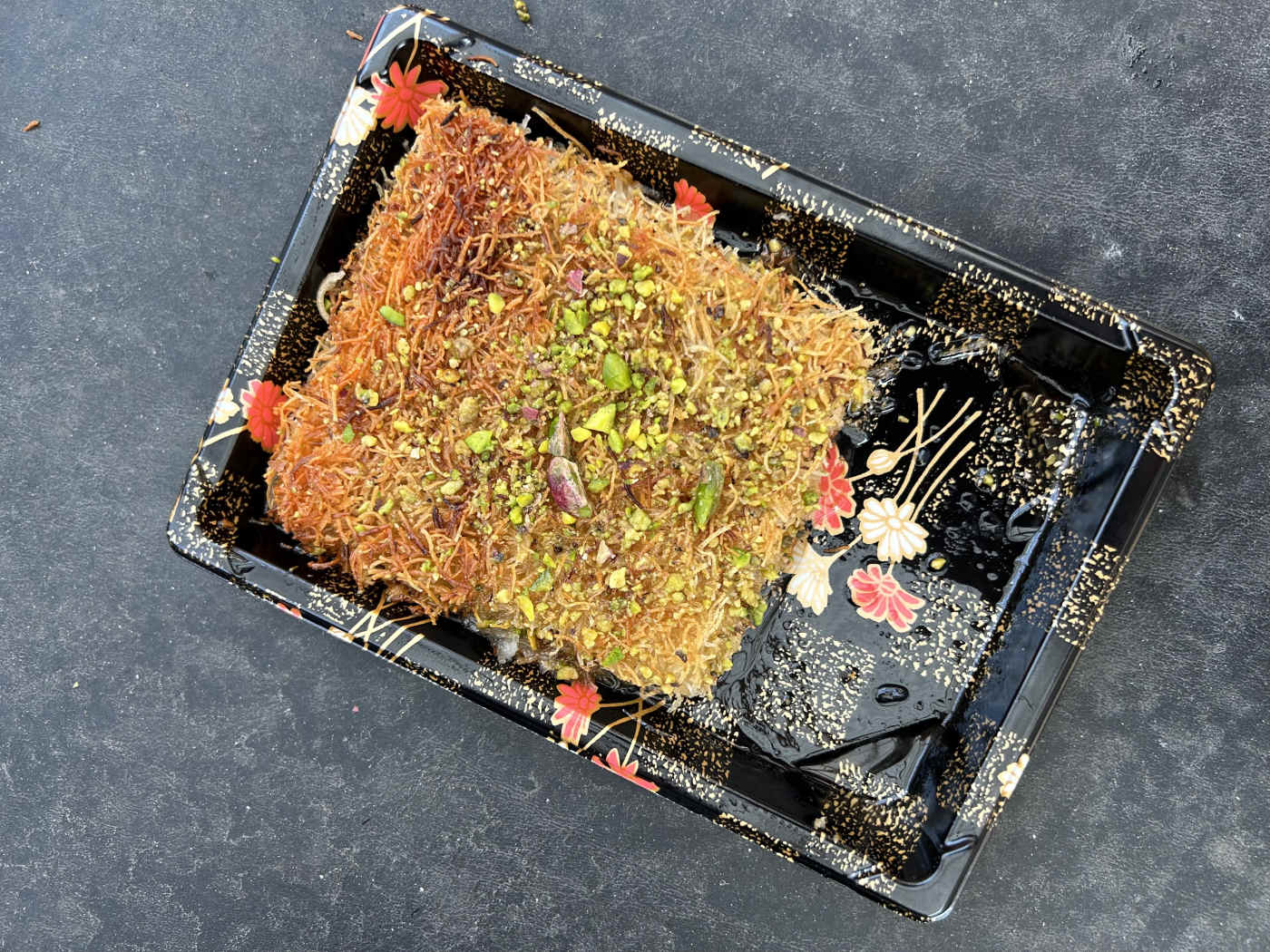 Middle Eastern sweets, fresh pastries, knafeh, baklava, and tea.