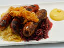 CHOICE OF SMOKED PORK BRATWURST OR SPICY PAPRIKAWURST 17 w braised sauerkraut, caramelized onions & Dijon mustard. Can't go wrong with sauerkraut bratwurst!