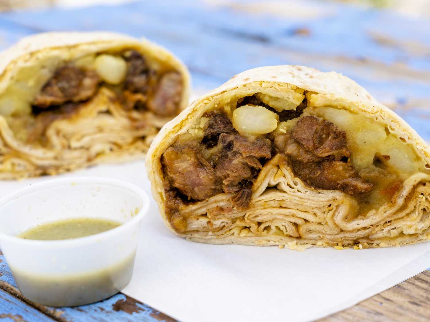 Oxtail roti, doubles, buss up shut, and curry dishes