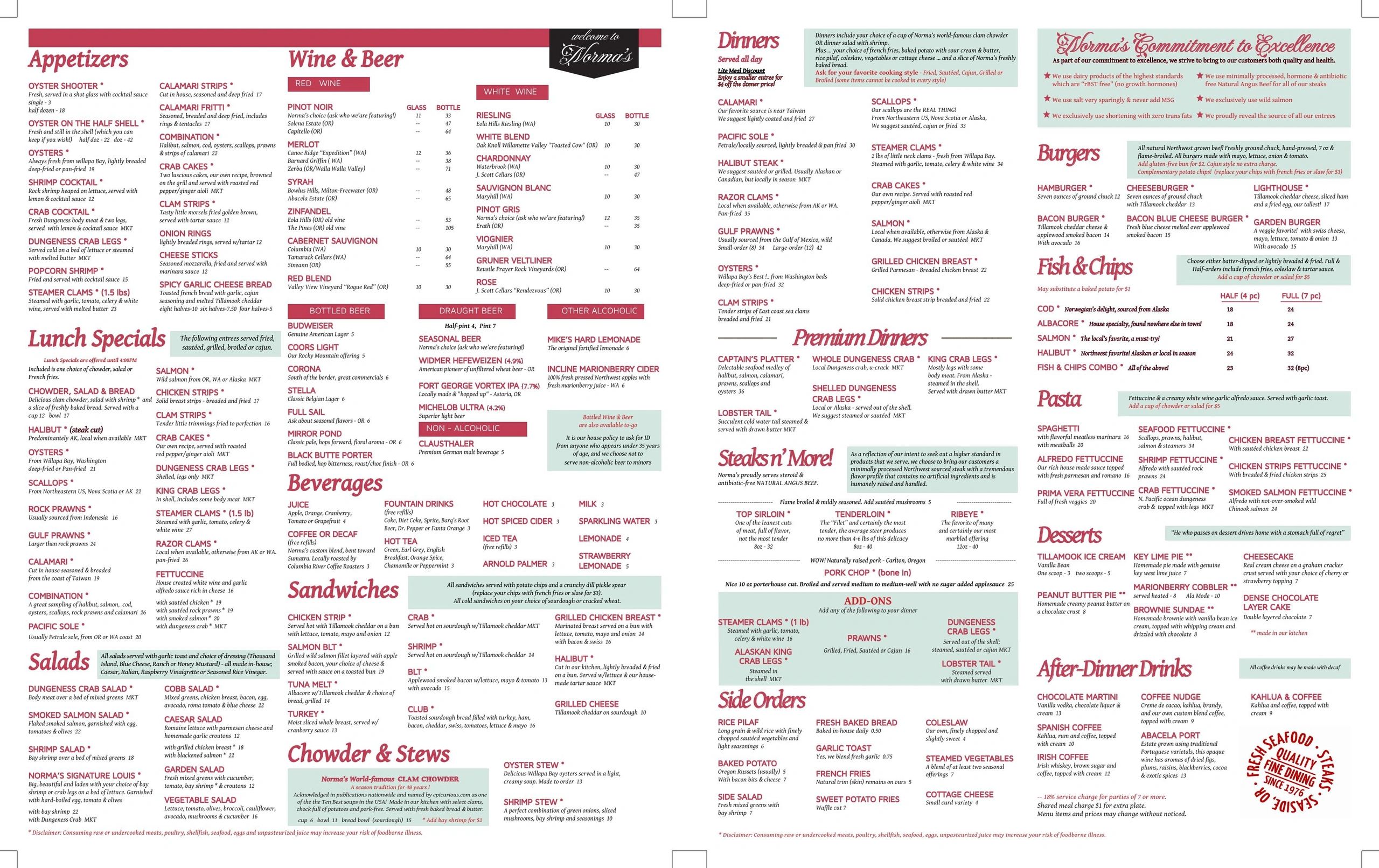 The clam chowder was superb.  We have sampled clam chowder throughout the northwest and Norma's is equal or superior to everything we've tried.