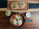 "Nua is an Israeli spot inside Beverly Hills’ Crescent Hotel that is very, well, Beverly Hills. But sometimes, a little extra flair is exactly what we’re looking for, and Nua’s food matches the setting. We love their gorgeous charred eggplant that’s roasted, peeled, and butterflied before getting topped with nutty tahini, oil, date syrup, and tangy tomato salsa. Their brunchtime shakshuka might not be as avant-garde as the dissected eggplant dish, but its bright red, slow-cooked tomato sauce is good enough for us. There’s a hint of heat but the garlic really shines through and we’re here for it. Besides the eggs also being perfectly cooked, we’re really big fans of the Jerusalem bagel–its sesame-coated crust and great chewiness make it ideal for dipping into runny yolks.