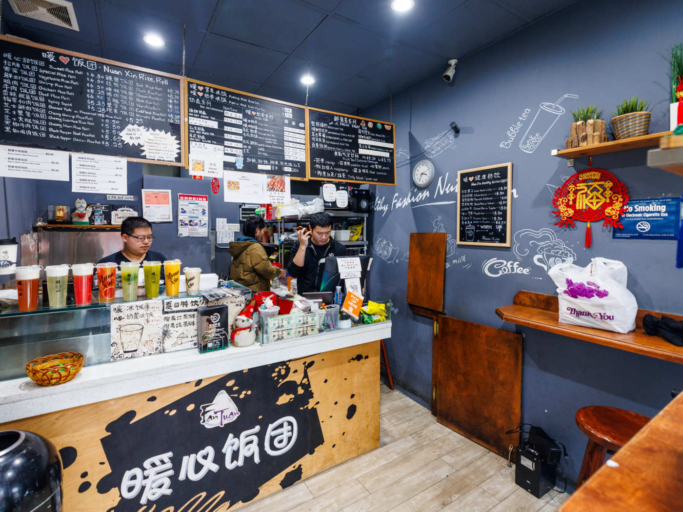 Also on the menu: Taiwanese sausages; shaved ice desserts; grain and nut-based drinkable porridges (similar in texture to avena); various milk, herbal, and fruit teas, which can be ordered hot or cold, with or without bubbles (tapioca pearls), jellies, popping fruit boba, or red bean.
