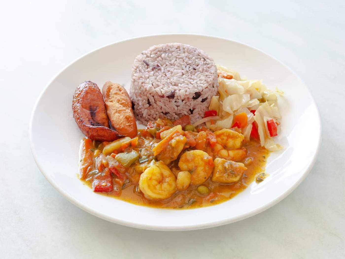 Jerk chicken, oxtails, curry goat, patties, rice & peas