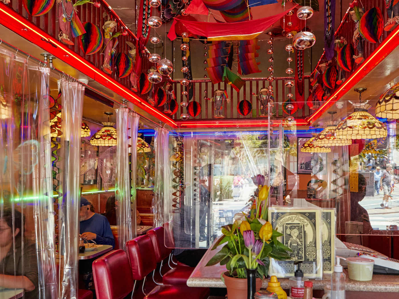 "A classic gay American diner, each table has an old school iPod, known in the day as a jukebox. Cheerfully red, vinyl, and festive since 1977. The window seats have an up close and personal view of the streetcars as they swing around for their return trip. It's just the right size for a cozy meal surrounded by vintage promotional posters for various art based SF events." - pixelstud