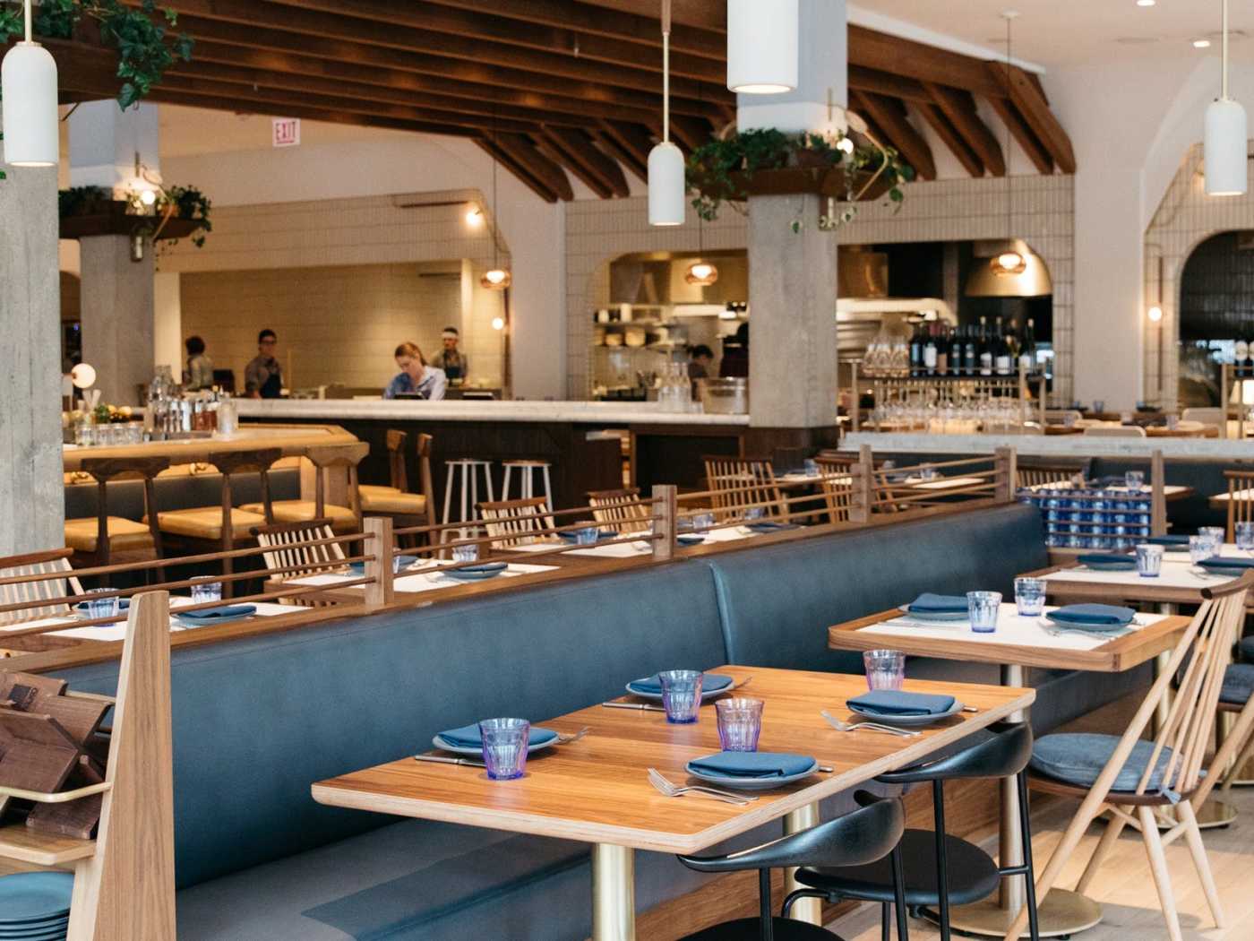 "COVID-19 update: Temporarily closed. Pacific Standard Time reminds us of some of our favorite restaurants in L.A. (Botanica, Gjusta, we're looking at you), and it’s clear that chef Erling Wu-Bower took cues from coastal California, both in menu, open kitchen, and modern, light-filled space. Drawing from Mexican, Italian, and Mediterranean flavors, you can expect plates of oven roasted asparagus marinated in black garlic molasses, trout in a fennel-mushroom broth, and margherita pizza with pistachio pesto from a wood-burning oven. For dessert, the huckleberry sundae and the sunflower cotton cake with strawberry syrup are winners. And since it's Chicago, a city that does happy hour particularly well, grabbing cocktails (we go for the rhubarb spritzes) at the bar is a popular way to kick off a visit. Photos: Brian Willette"