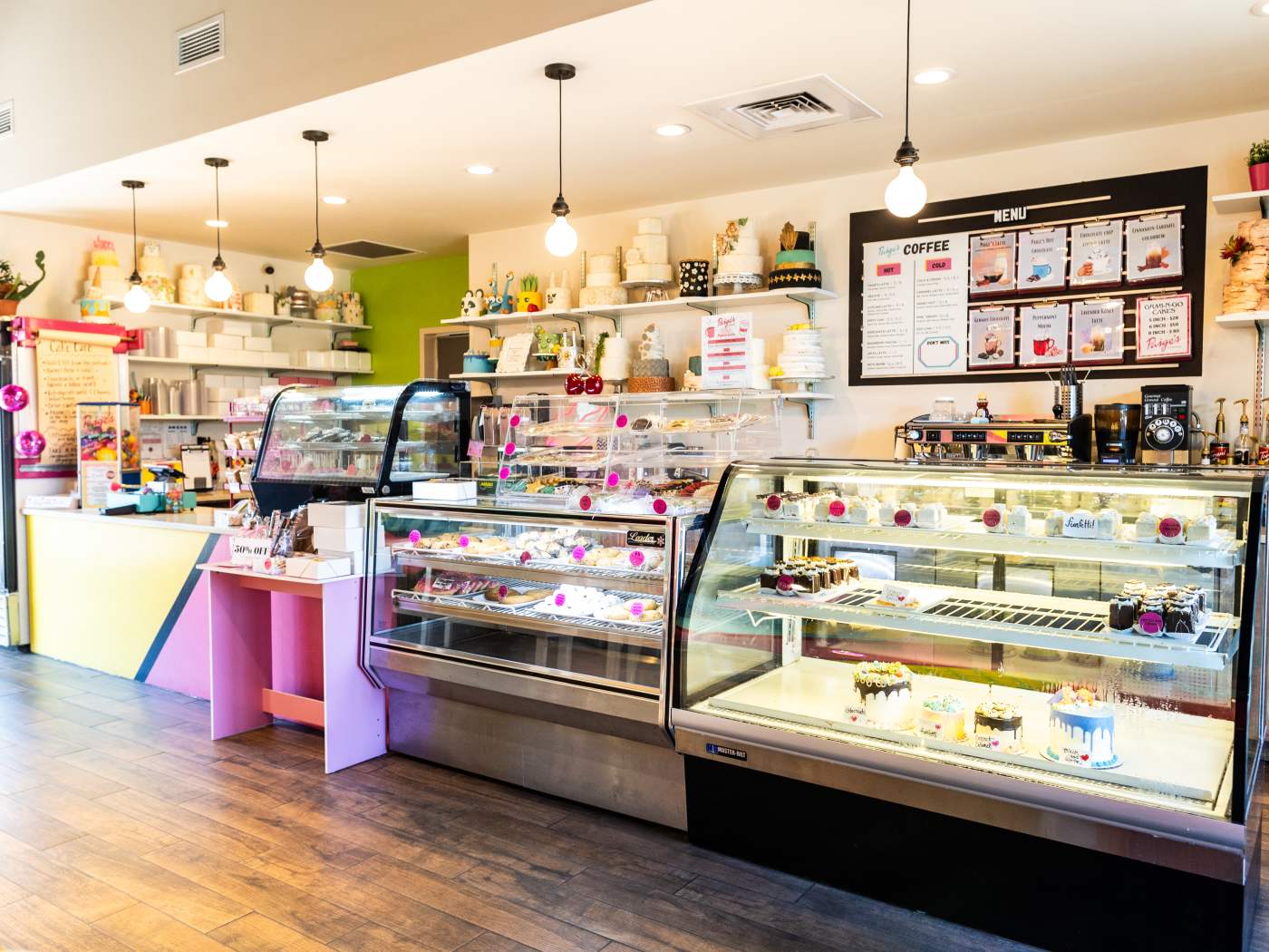 Cakes, cookies, pies, and coffee served in a cheerful space