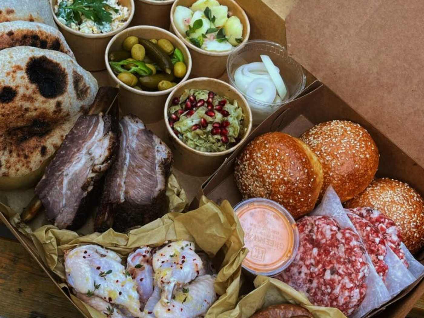 "If you’re hosting a grilling party (or need inspiration to carry that tiny charcoal grill up to your unfinished roof), know that one of our pandemic-era delivery projects, Parchment, is selling Al Ha’Esh 4th of July Grill Box (which translates to “on the fire” in Hebrew). Each kit comes with sourdough flatbread, dips, slaw and salads, pickles and olives, sweet corn, and your choice of protein to add on (honey-lemon chicken wings, merguez sausage, brisket burgers on challah sesame buns, or cumin dry-rub short ribs that are pre-smoked). Place your order for pick-up on 991 Atlantic Avenue in Brooklyn or delivery on Saturday." - Hannah Albertine