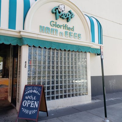 Peg's Glorified Ham N Eggs is an old school diner that runs on chaos. From hostess to waitress (& even owners?), the staff here are frantic. To make matters worse, there's zero air circulation inside; we opted to wait for an outdoor table despite warnings of high-ish winds rather than endure the steamy indoor seating. (Except for one insane dust storm, the elements, thankfully, weren't brutal to us.)