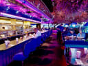 Neon-lit lounge with romantic booths, fruity cocktails & reflection pool