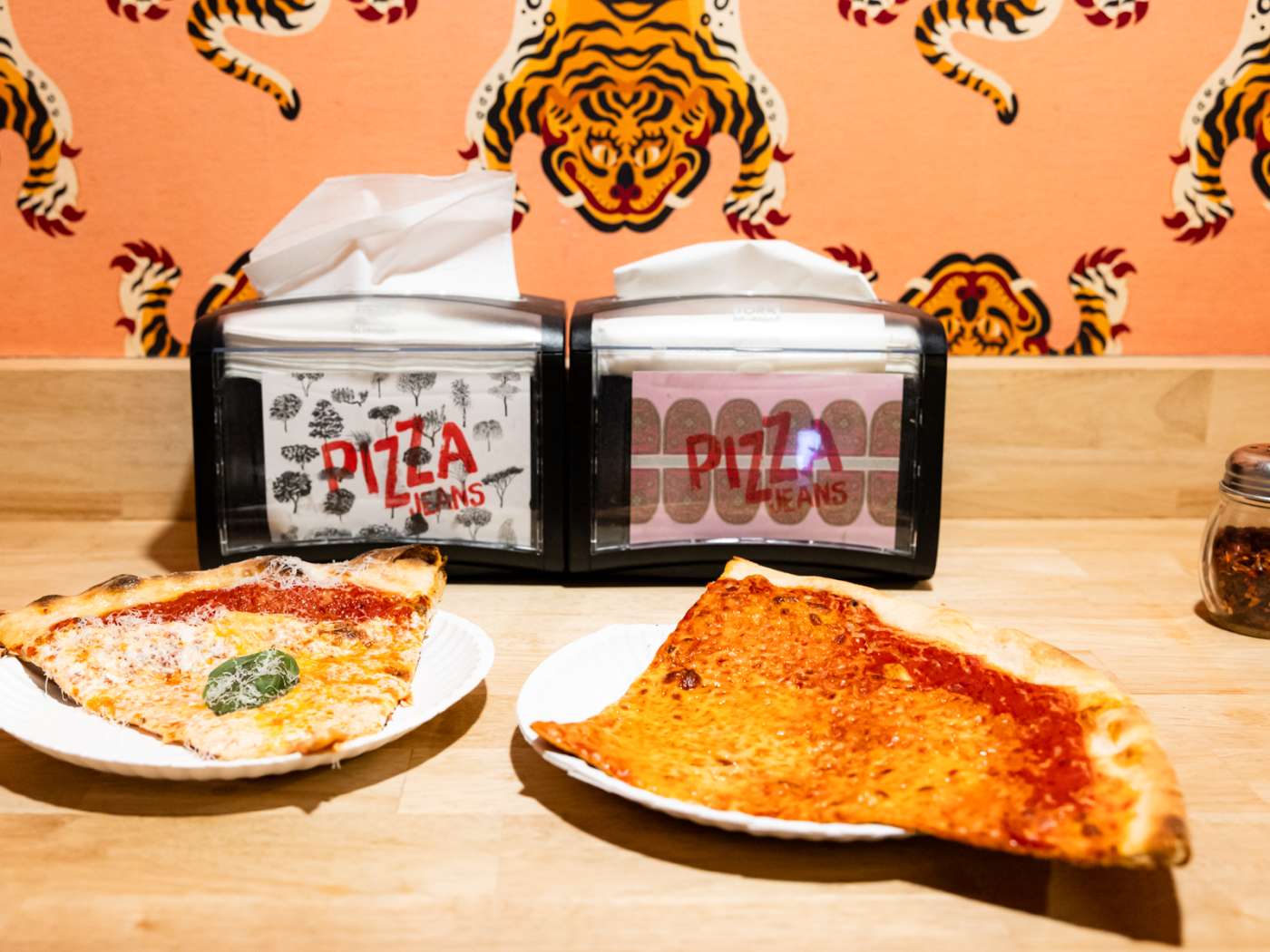"Walk by this pizza stall in Ponce City Market and your ears are immediately assaulted by noisy garage band music. There's also old-school pizzeria lighting fixtures combined with an order counter covered in pop culture stickers that jump from the Rat Pack to Notorious B.I.G. Then, workers behind the counter start tossing up huge circles of dough as if the visually and audibly loud venue needed a wee bit more to overstimulate. While you can order a whole NYC-style pie, most people (including us) opt for a giant slice, which you can top with the usual options. And that's why keep Pizza Jeans in mind when want to pop in for a quick, tasty slice after a BeltLine stroll. photo credit: Amy Sinclair photo credit: Amy Sinclair photo credit: Amy Sinclair Pause Unmute" - Juli Horsford