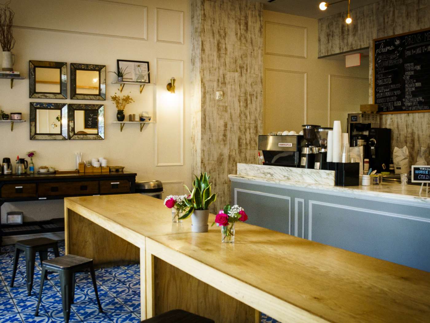 "After spending the day jostling your way through Union Market, refill at Pluma. The bakery feels like an oasis in an otherwise perpetually bustling part of town. There’s a wooden communal table that sits in the center of the room and blue Mediterranean tiles that gleam under lowlight. On the menu are an assortment of baked goods where you can expect the basics: muffins, croissants, and scones. But the subtle go-to option here are their juices like their coconut lemonade and their hibiscus tea. It’s a refreshing way to end a busy day. photo credit: Nina Palazzolo" - Omnia Saed