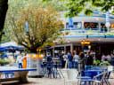 You order at the bar and seat yourself, there's mostly outdoor patio seating, mostly sheltered under a roof. If you order food you get a buzzer and go pick it up at the window when it's ready.