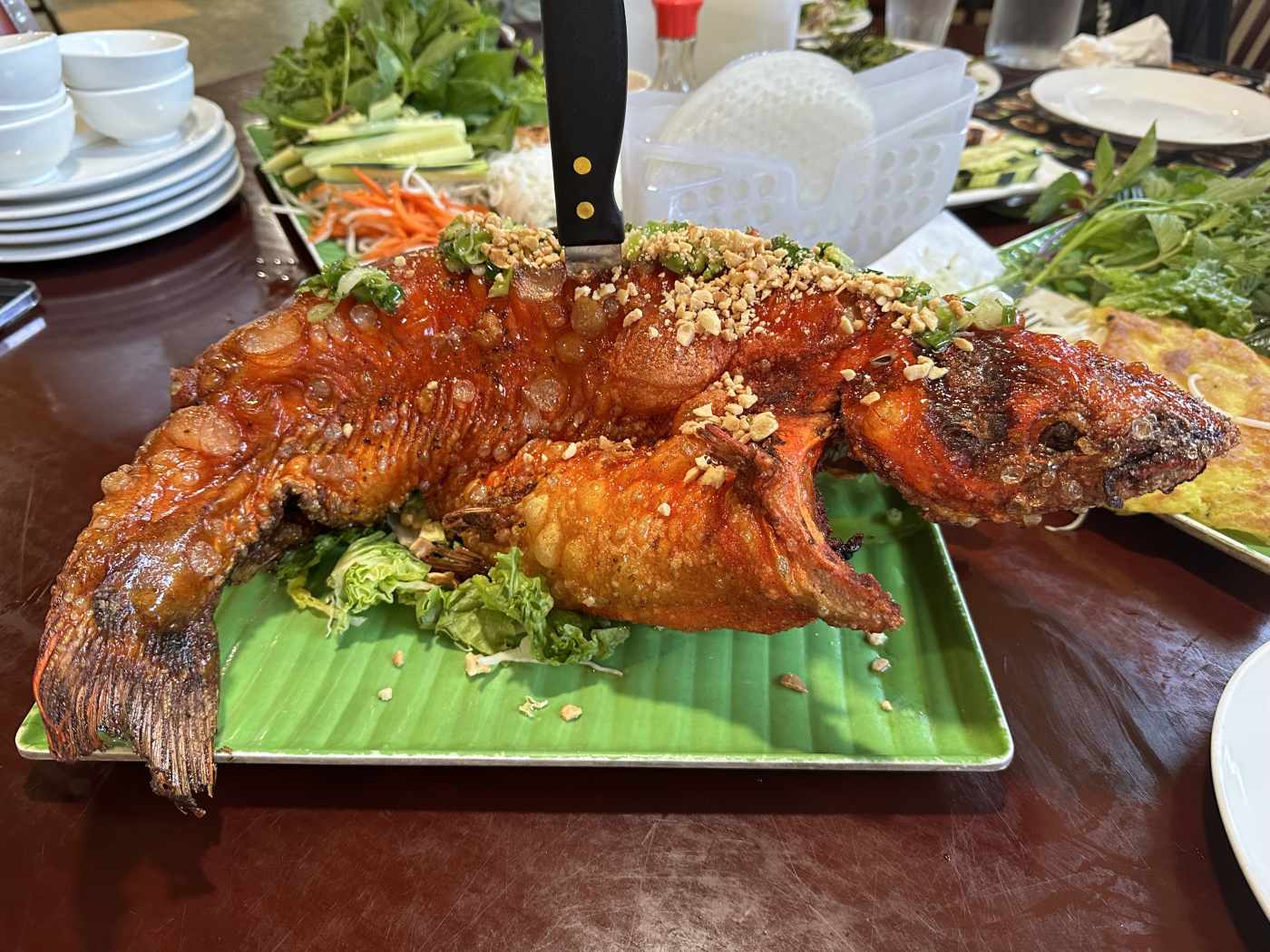 Authentic Vietnamese, famed for whole fried catfish & ong choy salad
