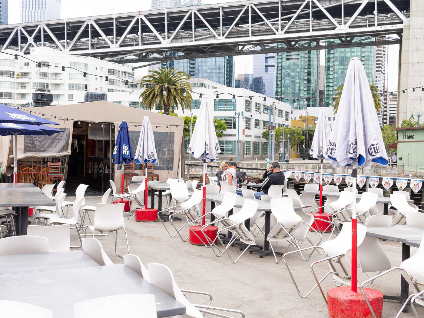 "Don’t let the exterior of this Embarcadero burger spot fool you. What you can’t see from the front of this place is the sizable patio hiding out back with picnic tables and benches that are surrounded by the water. Order a lunch combo with a serviceable burger or hot dog and a drink and stake your claim to a seat. This patio is uncovered, so try to find a table with an umbrella." - julia chen 1, patrick wong, ricky rodriguez