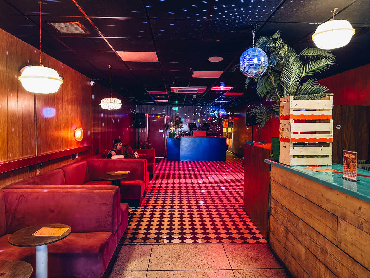 The decor has clearly had a concussion and has forgotten whether it is a disco a tropical party or a retro-diner. There is a disco ball overhanding a checkered tile floor with neon mini-sofas and a Hawaiian luau entrance/front. I think they are going for an 80's dingy-chic look but it's not my scene. It might be night out gold for someone else though, I suppose.
