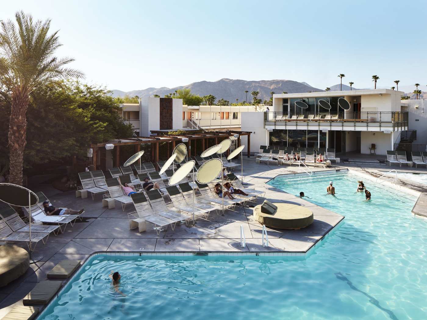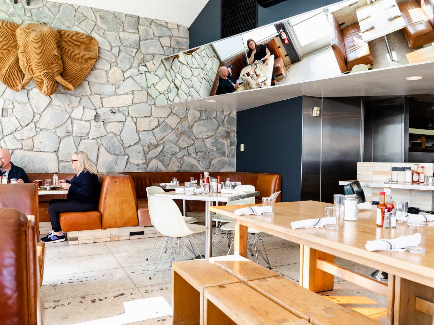 "If there’s one night to slide into a booth at this casual diner inside the hip Ace Hotel & Swim Club, make it a Monday. That’s when the place is transformed by the unmissable presence of 90-year-old ex-showgirl Shirley Claire, who sings and brings a healthy dose of razzle-dazzle as she hosts Fabulous Bingo. In fact, most nights of the week have a theme—see Tuesday karaoke at the adjacent Amigo Room bar, half-off wine bottles on Wednesday, and Taco Jueves—so making reservations is a good idea, but not a must. If you wind up waiting for a table, grab an Orange You Glad To See Me—made with gin, orange, Chareau, and lime—and pop into the photo booth. With its stone wall, leather booths, and globe pendant lights, the diner (a former Denny’s) embraces the spirit of the sixties, while the menu offers a distinctly Californian twist on Southwestern and Mexican fare. Must-orders: For breakfast (served until 2 p.m.), opt for the desert classic Date Shake and Huevos Rancheros, made with California- and Coachella Valley–sourced ingredients. For dinner, try the Grilled Mahi Mahi Tacos or Desert Highway Burgers, and request the pickled jalapeños for added kick."
