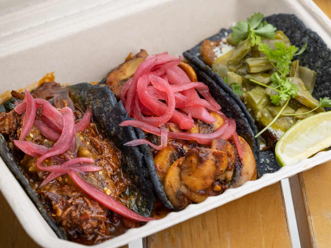 Birria burritos, mushroom tacos, pork belly, tater tots