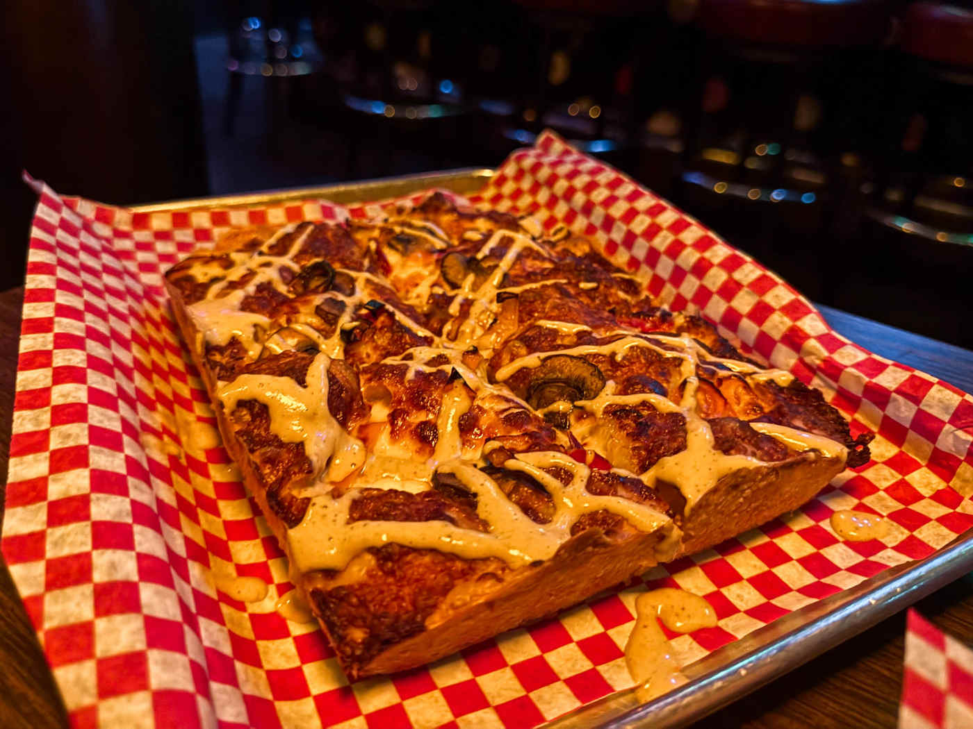 "Red Dwarf is a devilish dive bar known for pizza. The rock ’n roll joint doubles as a tiki bar complete with glowing glass orbs, pufferfish lamps, and tropical drinks including a lip-puckering Dole whip. You’ll find it tucked in a tiny strip mall where hungry locals swill $4 Dwarf Piss—a local light blond lager that’s a class above PBR—and devour thick, rectangular Detroit-style pizzas. For the perfect sweet and spicy combination, try the Pineapple Does Belong on Pizza topped with brown sugar-glazed ham, jalapeños, and pineapple. The White Pie, however, was a bit dry with just a light drizzle of the garlic cream sauce. But that’s something you can debate with your new friends in the tight quarters of the zig-zagging, Tetris-shaped bar." - Ryan Slattery