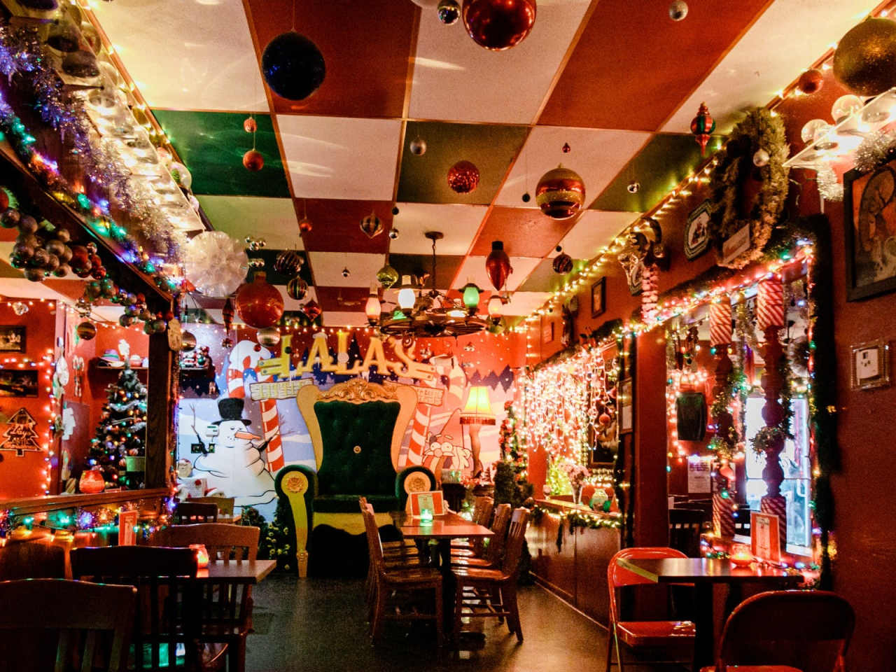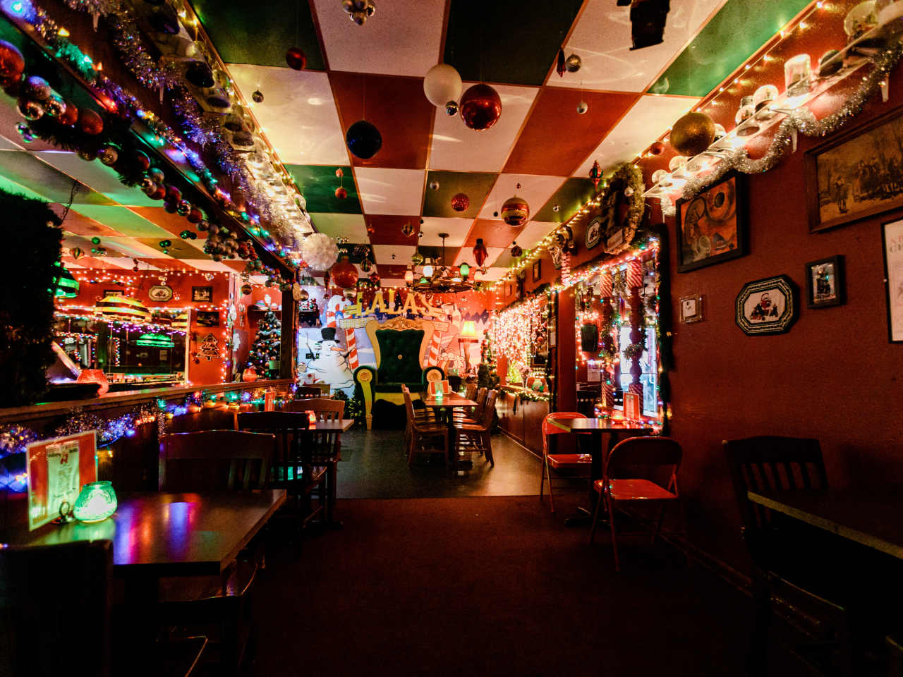 Year-round holiday decor, jukebox, drinks & games at a dive bar