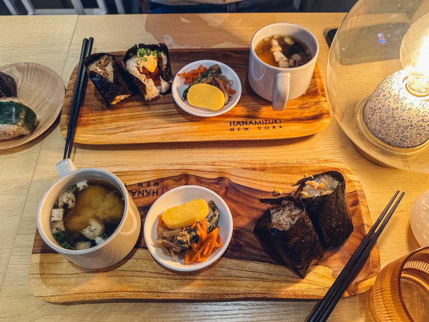 "We first found Hanamizuki Cafe on West 29th after a particularly harrowing 10 minutes of dodging the tourists of Herald Square. At the time, their onigiri combo and steamy mug of miso soup brought us back to the realm of the living. And now we never get off the train at 34 St-Harlod Square station without seriously considering a stop. The mother and daughter who run the operation—which opened in 2012 and then closed during the pandemic before returning in 2024 in its original space—make all of the onigiri to order, wrapping seaweed around warm sushi rice around flaky salmon, or a dollop of mentaiko, and passing yours over the counter. Even if you've got somewhere to be, these fresh onigiri deserve a seat. So take five minutes to sit in the cafe-esque dining room while you sip your mug of miso in between bites. Food Rundown Onigiri Combo For $16, you’ll get to choose two onigiri, which come on a platter with miso soup and the daily side dishes—like slightly sweet tamagoyaki and goma-ae slick with sesame dressing. As for the onigiri, we like the grilled salmon with shiso, and the sukiyaki, which is blended with the rice so that each bite has shreds of sweet, soy sauce-laced beef and slivers of scallion." - Willa Moore
