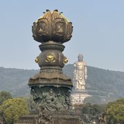 We came to see and experience the Chinese New Year decorations, festivities, and to try out their $10 vegetarian buffet last month. You do not need to be Buddhist to visit, however just be respectful of the customs and dress code while visiting. To enter into the courtyard, climb up the stairs into the main temple (no pics allowed inside this portion of the temple). Bow 3 times, donate, pick a fortune from a little bowl. Then turn left; there is an door-sized opening and hallway that will lead you to the courtyard where the wishing tree, main decorations, a bell, and the restaurant for the buffet is. For a couple of dollars, you can pick a wish, and throw it up to the wishing tree. Pro tip: if you can't read Chinese, there is a paper with translations for each numbered saying. Also, wrap up your ribbon around the medal to get the best trajectory to throw and best chances of your wish sticking to the tree the first time.